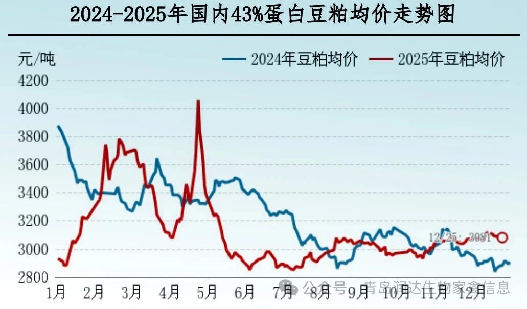 本周全国43%蛋白豆粕周度均价3085元/吨,与上周均价相比,下跌23元/吨,跌幅0.74%。