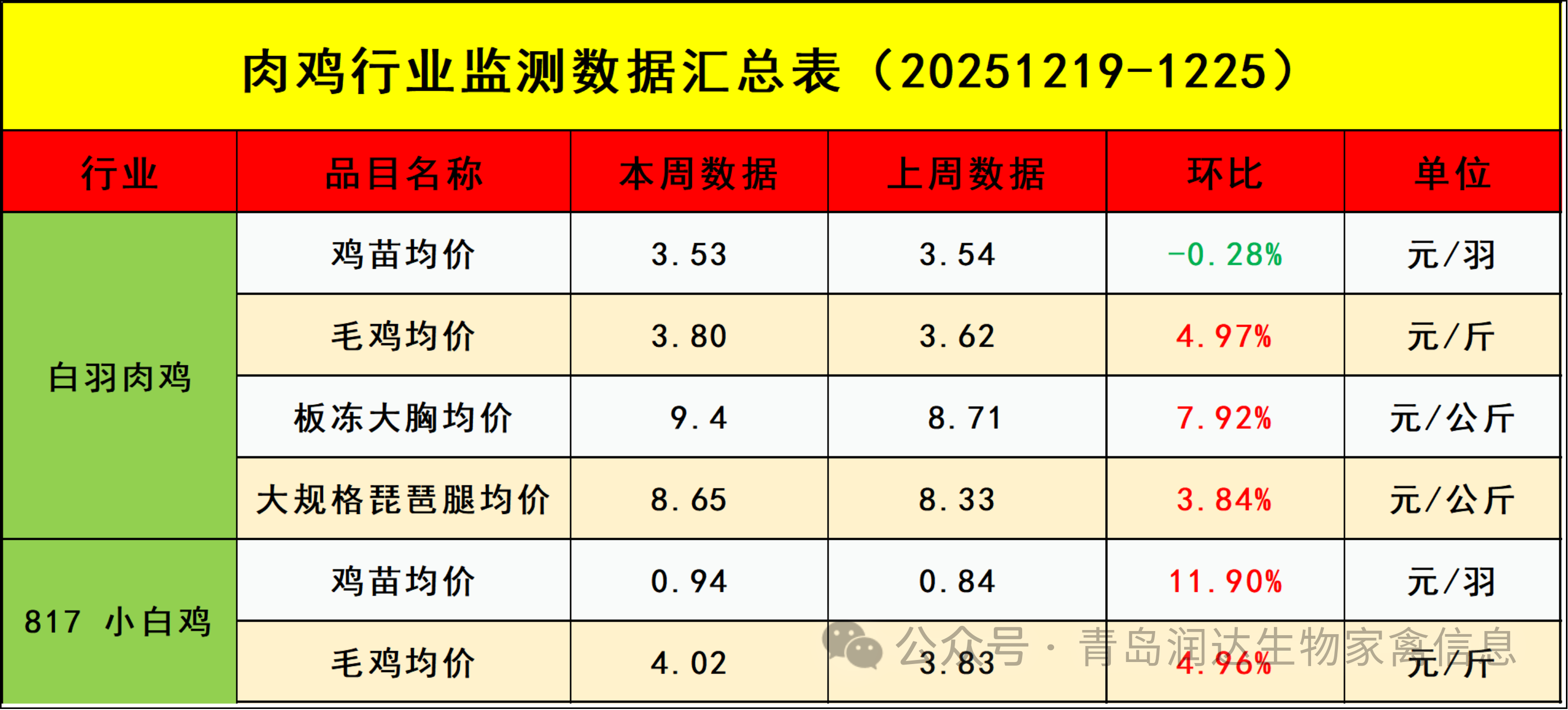 本周白羽肉鸡产品综合售价均上涨,其中板冻大胸周度均价9.40元/公斤,与上周均价相比,上涨0.69元/公斤,涨幅7.92%;大规格琵琶腿周度均价8.65元/公斤,与上周均价相比,上涨0.32元/公斤,涨幅3.84%。