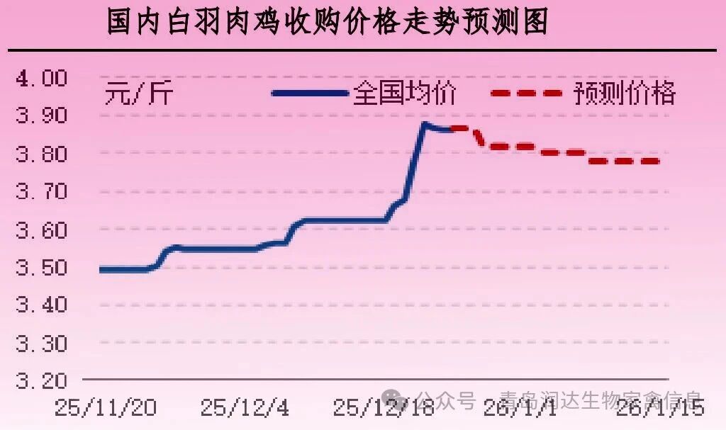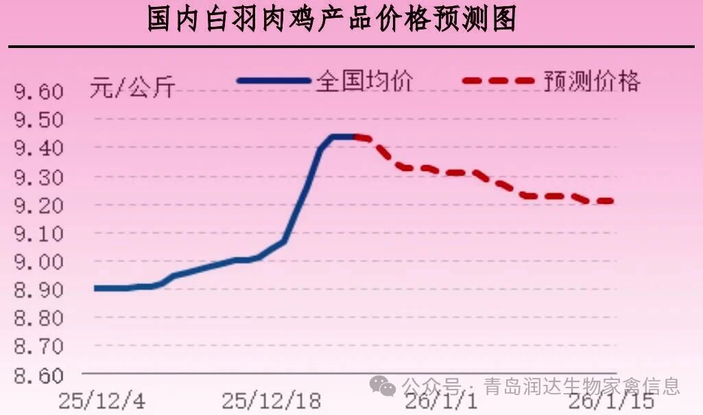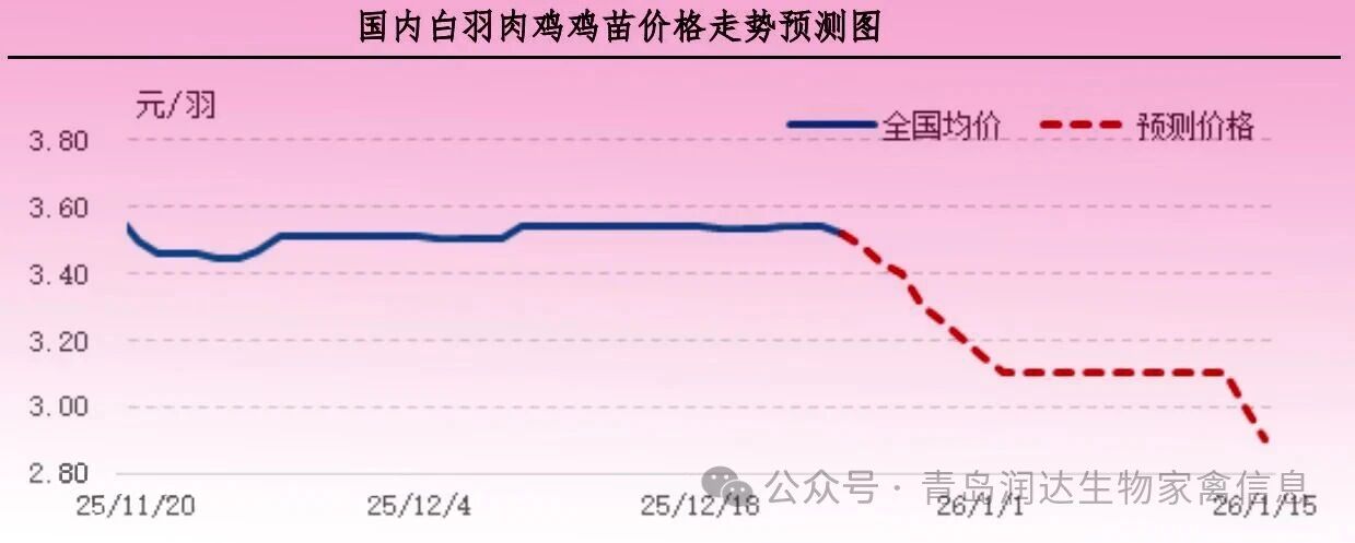 白羽肉鸡鸡苗:预计未来一周全国白羽肉鸡鸡苗价格或呈震荡下滑趋势,周均价环比下跌。据相关机构调研发现,下周孵化场出苗量或继续减少,年前最后一批毛鸡补栏陆续收尾,苗市需求转淡,孵化场排苗压力增大,让利操作增多,鸡苗价格或承压下跌。