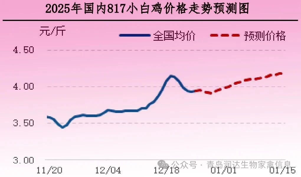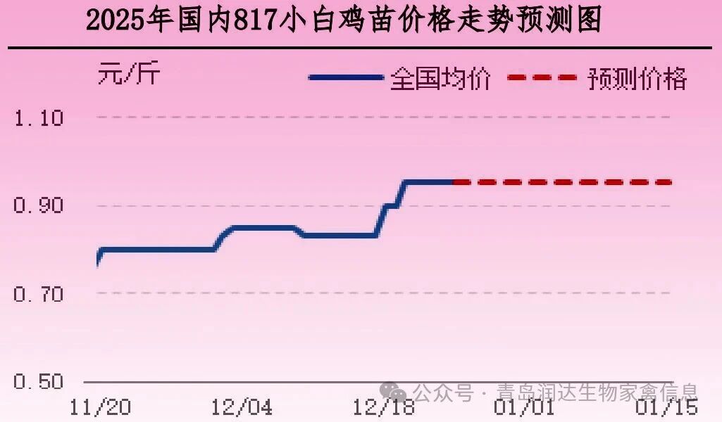 817小白鸡鸡苗:短期内毛鸡市场或调整有限,养殖端补栏情绪平稳,鸡苗价格或涨跌两难,预计下周鸡苗市场以稳为主,均价环比稳定。1月上旬鸡苗市场进入停苗期,届时鸡苗价格或延续停苗前价格。预计未来三周817小白鸡苗价格呈平稳运行态势。
