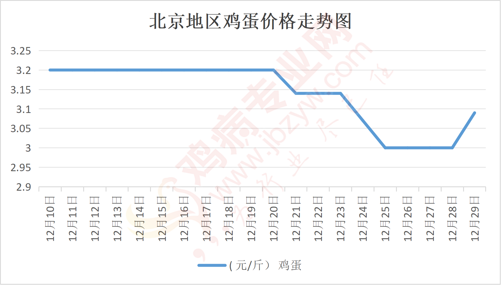 鸡病专业网消息:12月29日,北京大洋路鸡蛋主流批发价格135-138元/44斤,涨,到货8台车,成交灵活,走货正常偏快;回龙观鸡蛋136元/44斤,涨;顺义石门鸡蛋136元/44斤,涨。