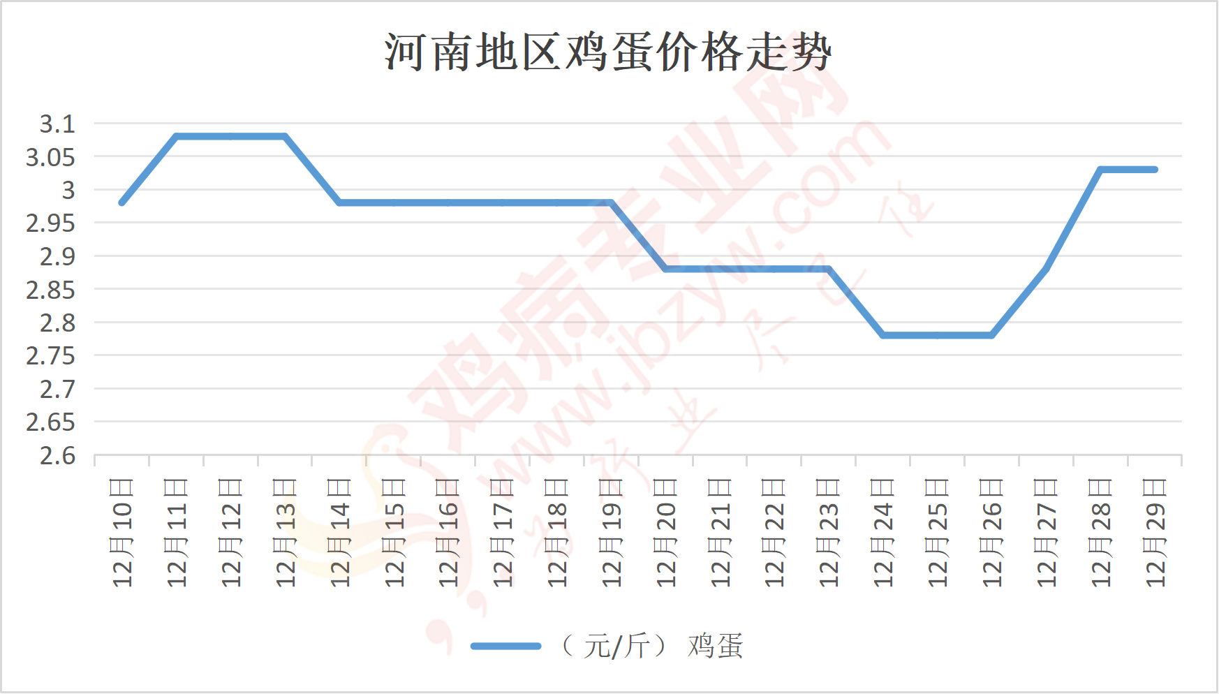 鸡病专业网消息:12月29日,河南郑州鸡蛋3.05元/斤,稳;新密鸡蛋3.05元/斤,稳;荥阳鸡蛋3.05元/斤,稳;中牟鸡蛋3.05元/斤,稳;周口鸡蛋3元/斤,稳;商丘鸡蛋91元/30斤,稳;鹤壁鸡蛋3元/斤,稳;汝州鸡蛋3元/斤,稳;开封鸡蛋91元/30斤,稳;漯河鸡蛋3元/斤,稳;漯河临颍鸡蛋3元/斤,稳;许昌鸡蛋3.05元/斤,稳;南阳鸡蛋3元/斤,稳;南阳邓州鸡蛋3元/斤,稳;新乡鸡蛋3元/斤,稳;安阳鸡蛋3元/斤,稳;新郑鸡蛋3.05元/斤,稳;登封鸡蛋3.05元/斤,稳;平顶山鸡蛋3.05元/斤,稳;驻马店鸡蛋3.05元/斤,稳;三门峡鸡蛋3.05元/斤,稳;焦作鸡蛋3元/斤,稳;信阳鸡蛋3元/斤,稳;濮阳鸡蛋3元/斤,稳。