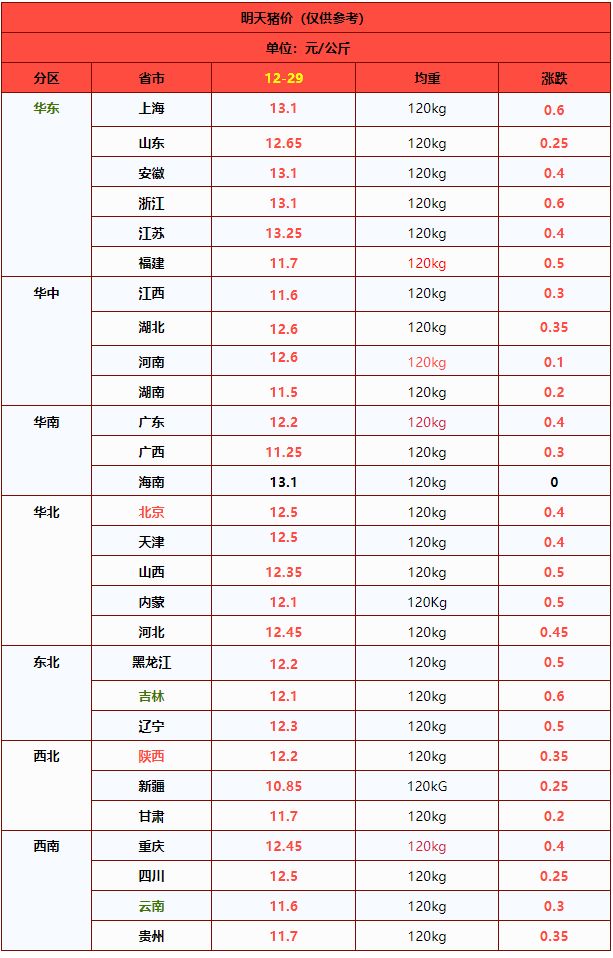 | 西北 | 陕西省 | 12.02 | 11.86 | 1.36% | 元/KG |
