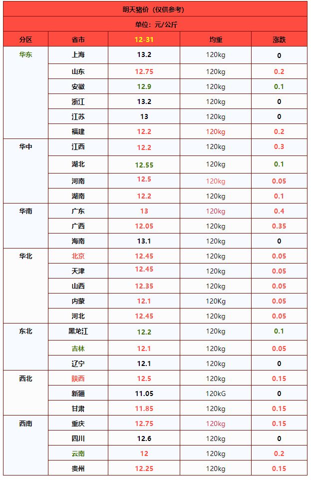 | 浙江省 | 12.61 | 12.49 | 0.96% | 元/KG | |