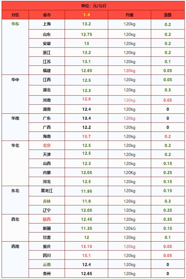 | 西南 | 重 庆 | 13.16 | 13.13 | 0.23% | 元/KG |