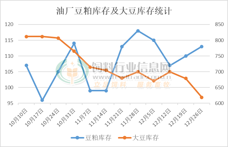 虽说近期进口大豆到港数量较前期逐渐下降,即使国家粮库陆续拍卖陈作进口大豆,在较高的开机压榨水平下,油厂大豆库存继续处于下降的趋势,产生的豆粕数量较大。随着下游饲料养殖企业为需求旺季备货后豆粕库存有所下降,但继续拿货谨慎,豆粕库存出现止降转升的趋势。截止12月26日当周,全国主要油厂进口大豆库存619万吨,同比下降36万吨,豆粕库存113万吨,同比增加43万吨,较过去三年同期均值增加40万吨,继续处于供应宽松格局。