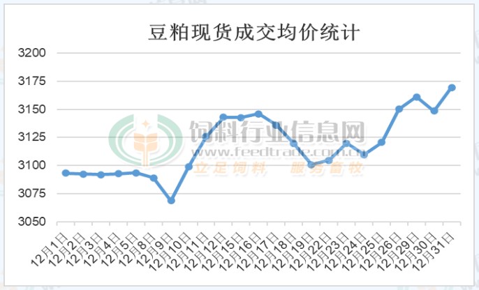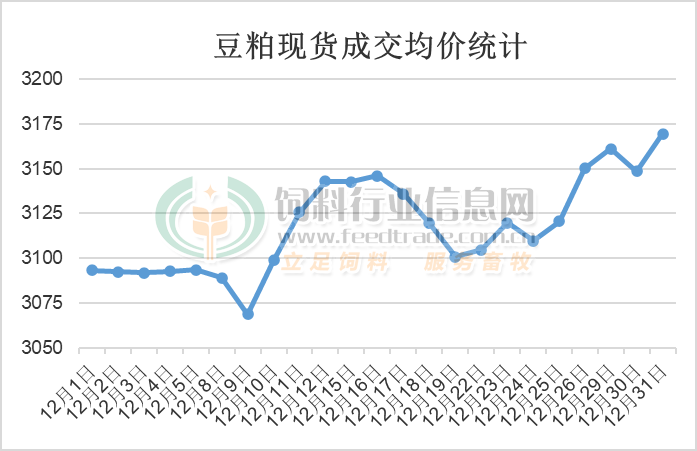 受进口大豆成本跟随美盘大豆下跌影响,在豆油跟随进口大豆下跌后,油粕跷跷板效应下油厂对豆粕的挺价意愿较强,叠加国内畜禽养殖对豆粕的需求旺季逐渐来临,豆粕价格仍出现偏强运行走势,但市场豆粕供应宽松限制其上涨幅度。据饲料行业网豆粕分析师统计,豆粕价格在12月处于震荡略偏强走势,高低价差101元/吨,最终12月主要油厂43%蛋白豆粕成交均价3118.2元/吨,较11月均价继续上涨31.7元/吨,上涨幅度为1.03%。具体分析如下: