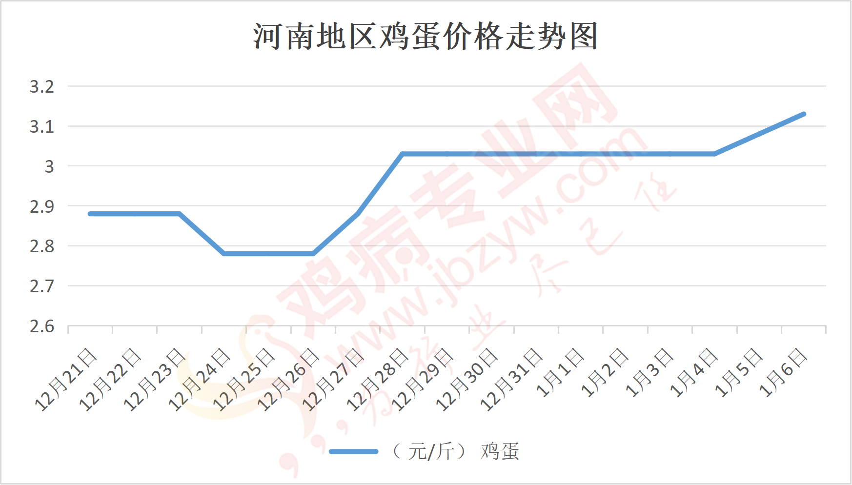鸡病专业网消息:1月6日,河南郑州鸡蛋3.15元/斤,涨;新密鸡蛋3.15元/斤,涨;荥阳鸡蛋3.15元/斤,涨;中牟鸡蛋3.15元/斤,涨;周口鸡蛋3.1元/斤,涨;商丘鸡蛋94元/30斤,涨;鹤壁鸡蛋3.1元/斤,涨;汝州鸡蛋3.1元/斤,涨;开封鸡蛋94元/30斤,涨;漯河鸡蛋3.1元/斤,涨;漯河临颍鸡蛋3.1元/斤,涨;许昌鸡蛋3.15元/斤,涨;南阳鸡蛋3.1元/斤,涨;南阳邓州鸡蛋3.1元/斤,涨;新乡鸡蛋3.1元/斤,涨;安阳鸡蛋3.1元/斤,涨;新郑鸡蛋3.15元/斤,涨;登封鸡蛋3.15元/斤,涨;平顶山鸡蛋3.15元/斤,涨;驻马店鸡蛋3.15元/斤,涨;三门峡鸡蛋3.15元/斤,涨;焦作鸡蛋3.1元/斤,涨;信阳鸡蛋3.1元/斤,涨;濮阳鸡蛋3.1元/斤,涨。