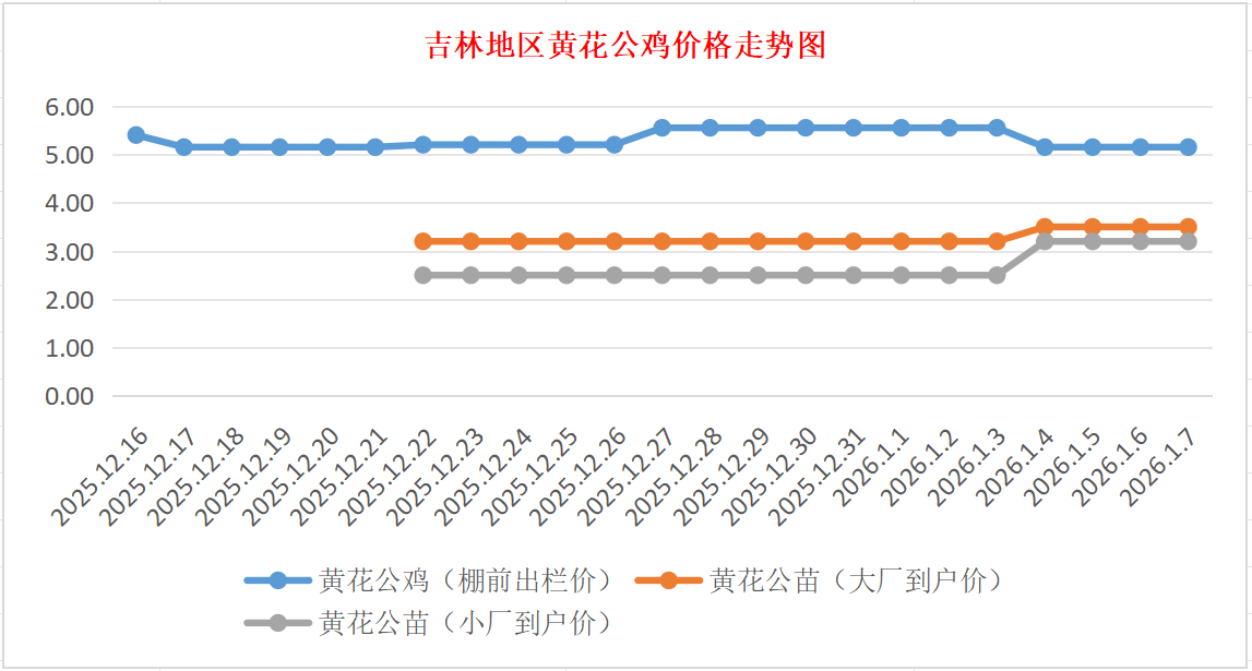 黄花公苗:价格稳定,大厂到户价3.50元/羽,小厂到户价3.20元/羽,稳。