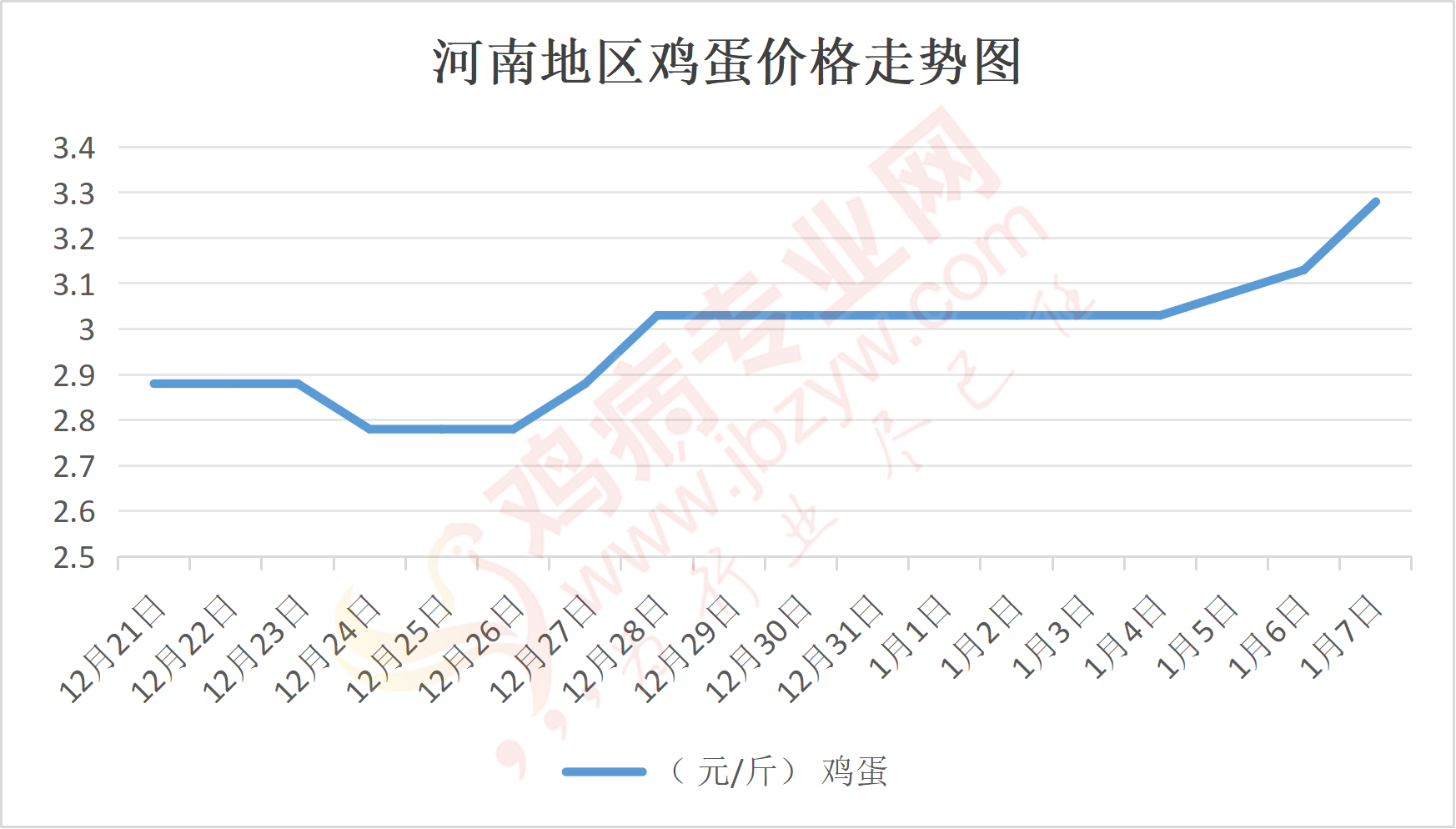 鸡病专业网消息:1月7日,河南郑州鸡蛋3.3元/斤,涨;新密鸡蛋3.3元/斤,涨;荥阳鸡蛋3.3元/斤,涨;中牟鸡蛋3.3元/斤,涨;周口鸡蛋3.25元/斤,涨;商丘鸡蛋98元/30斤,涨;鹤壁鸡蛋3.25元/斤,涨;汝州鸡蛋3.25元/斤,涨;开封鸡蛋97-98元/30斤,涨;漯河鸡蛋3.25元/斤,涨;漯河临颍鸡蛋3.25元/斤,涨;许昌鸡蛋3.3元/斤,涨;南阳鸡蛋3.25元/斤,涨;南阳邓州鸡蛋3.25元/斤,涨;新乡鸡蛋3.25元/斤,涨;安阳鸡蛋3.25元/斤,涨;新郑鸡蛋3.3元/斤,涨;登封鸡蛋3.3元/斤,涨;平顶山鸡蛋3.3元/斤,涨;驻马店鸡蛋3.3元/斤,涨;三门峡鸡蛋3.3元/斤,涨;焦作鸡蛋3.25元/斤,涨;信阳鸡蛋3.25元/斤,涨;濮阳鸡蛋3.25元/斤,涨。