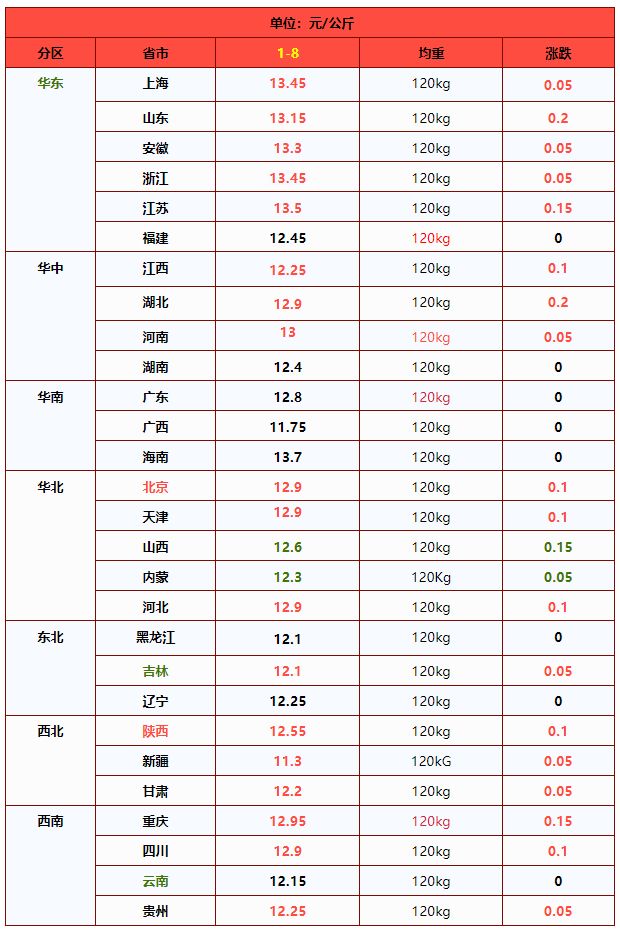 | 山东省 | 13.15 | 12.99 | 1.23% | 元/KG | |