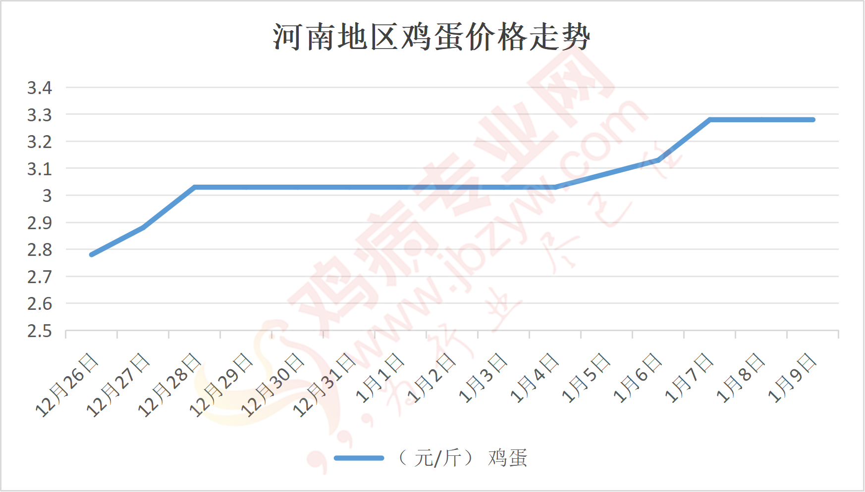 鸡病专业网消息:1月9日,河南郑州鸡蛋3.3元/斤,稳;新密鸡蛋3.3元/斤,稳;荥阳鸡蛋3.3元/斤,稳;中牟鸡蛋3.3元/斤,稳;周口鸡蛋3.25元/斤,稳;商丘鸡蛋98元/30斤,稳;鹤壁鸡蛋3.25元/斤,稳;汝州鸡蛋3.25元/斤,稳;开封鸡蛋97-98元/30斤,稳;漯河鸡蛋3.25元/斤,稳;漯河临颍鸡蛋3.25元/斤,稳;许昌鸡蛋3.3元/斤,稳;南阳鸡蛋3.25元/斤,稳;南阳邓州鸡蛋3.25元/斤,稳;新乡鸡蛋3.25元/斤,稳;安阳鸡蛋3.25元/斤,稳;新郑鸡蛋3.3元/斤,稳;登封鸡蛋3.3元/斤,稳;平顶山鸡蛋3.3元/斤,稳;驻马店鸡蛋3.3元/斤,稳;三门峡鸡蛋3.3元/斤,稳;焦作鸡蛋3.25元/斤,稳;信阳鸡蛋3.25元/斤,稳;濮阳鸡蛋3.25元/斤,稳。