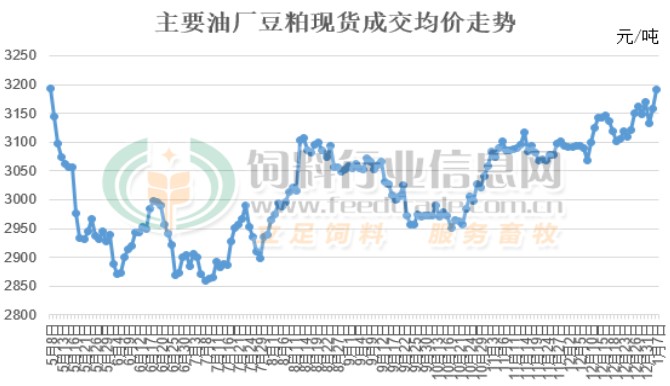 从近日豆粕现货及期货价格能够持续上行来看,主要因国内养殖端需求旺季到来后,饲料养殖企业对豆粕刚性需求增加;加之元旦小长假期间部分工厂减产后压榨大豆减少导致豆粕产量下降并缓解终端饲料养殖企业的观望心态,拿货需求增多,油厂豆粕库存下降后增强油厂对豆粕的挺价意愿,支撑豆粕价格出现持续小幅的上行走势,油厂豆粕现货成交均价上涨至8个月以来的高点。