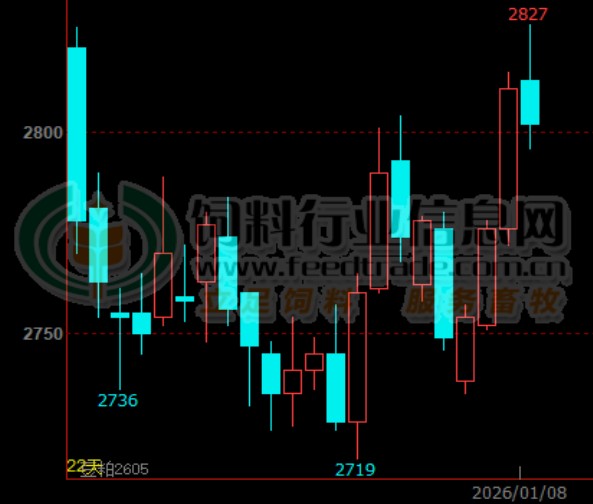 近期豆粕市场在需求逐渐旺季来临时出现了产量下降的情况,增强了油厂对豆粕的挺价动力,即使供应仍然充裕的情况下价格依然出现了逐步上行的走势。据饲料行业新希望统计数据显示,截止1月7日国内主要油厂43%蛋白豆粕现货成交均价已经上涨至3190元/吨,已将抵达2025年5月8日以来的新高。连盘豆粕主力2605持续四日上涨,今日高开高走,最高达2827元/吨;其它合约也不甘示弱,均出现了不同的涨幅。