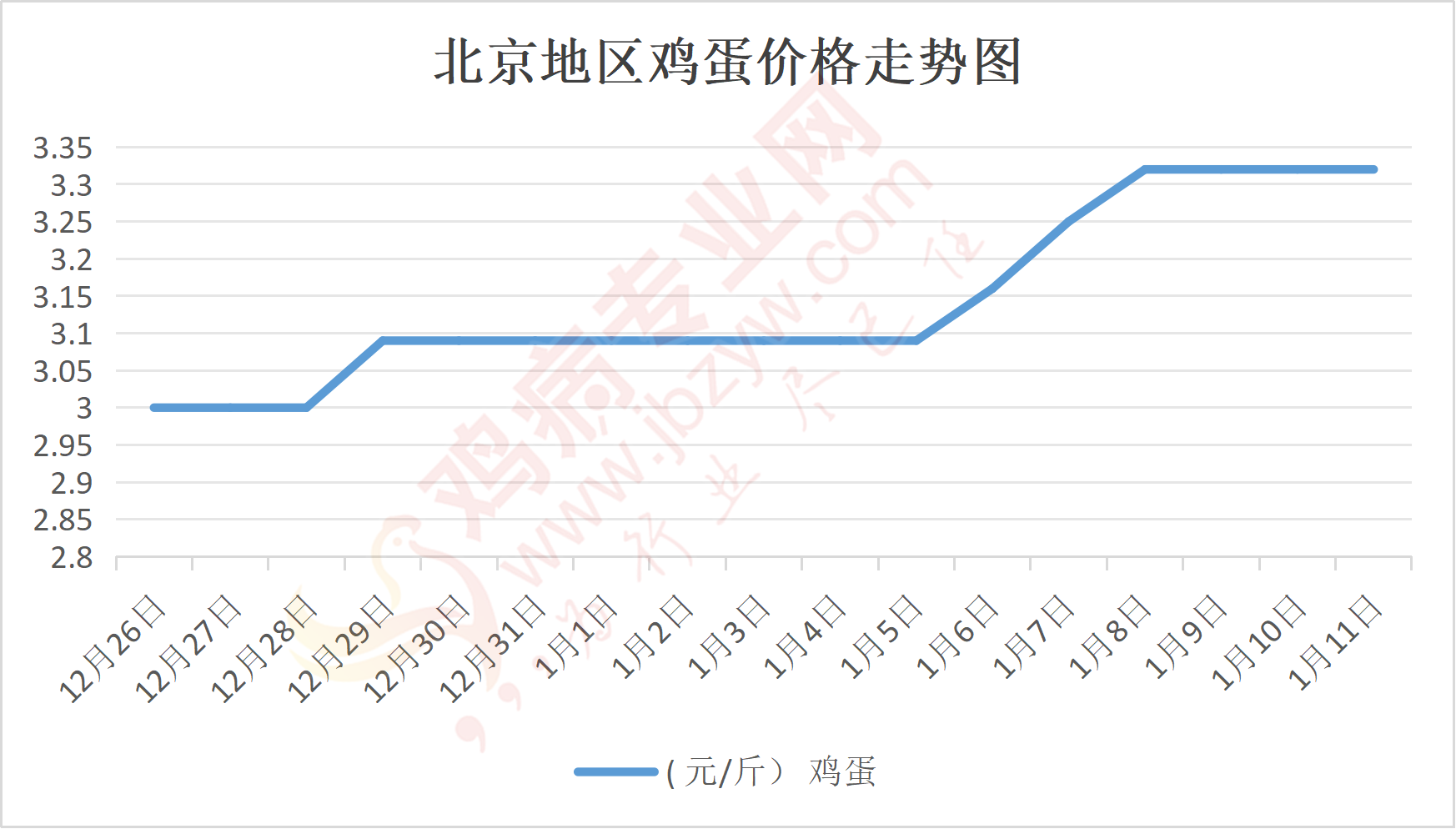 鸡病专业网消息:1月11日,北京大洋路鸡蛋主流批发价格146-147元/44斤,稳,到货3台车,成交灵活,走货正常;回龙观鸡蛋146元/44斤,稳;顺义石门鸡蛋146元/44斤,稳。