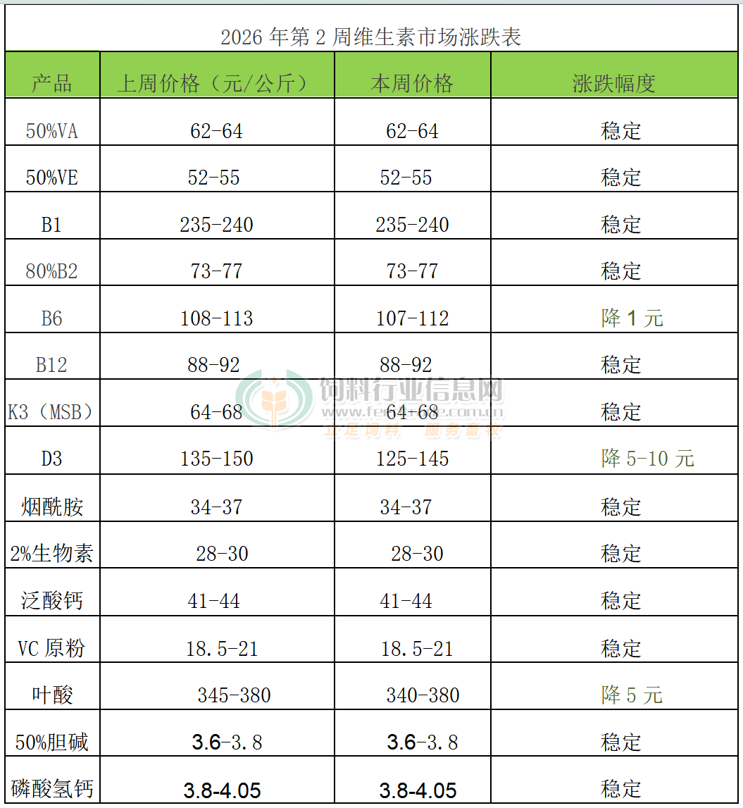 VA:本周VA市场报价62-64元/公斤。欧洲VA1000市场报价15-16欧元/公斤。2025年3月万华化学VA产业链投产。6月12日巴斯夫VA解除不可抗力影响。10月28日市场称部分厂家报价提至70-72元/公斤。12月30日市场称浙江医药VA产品停报。2026年1月6日市场称新和成VA提价至70元/公斤。