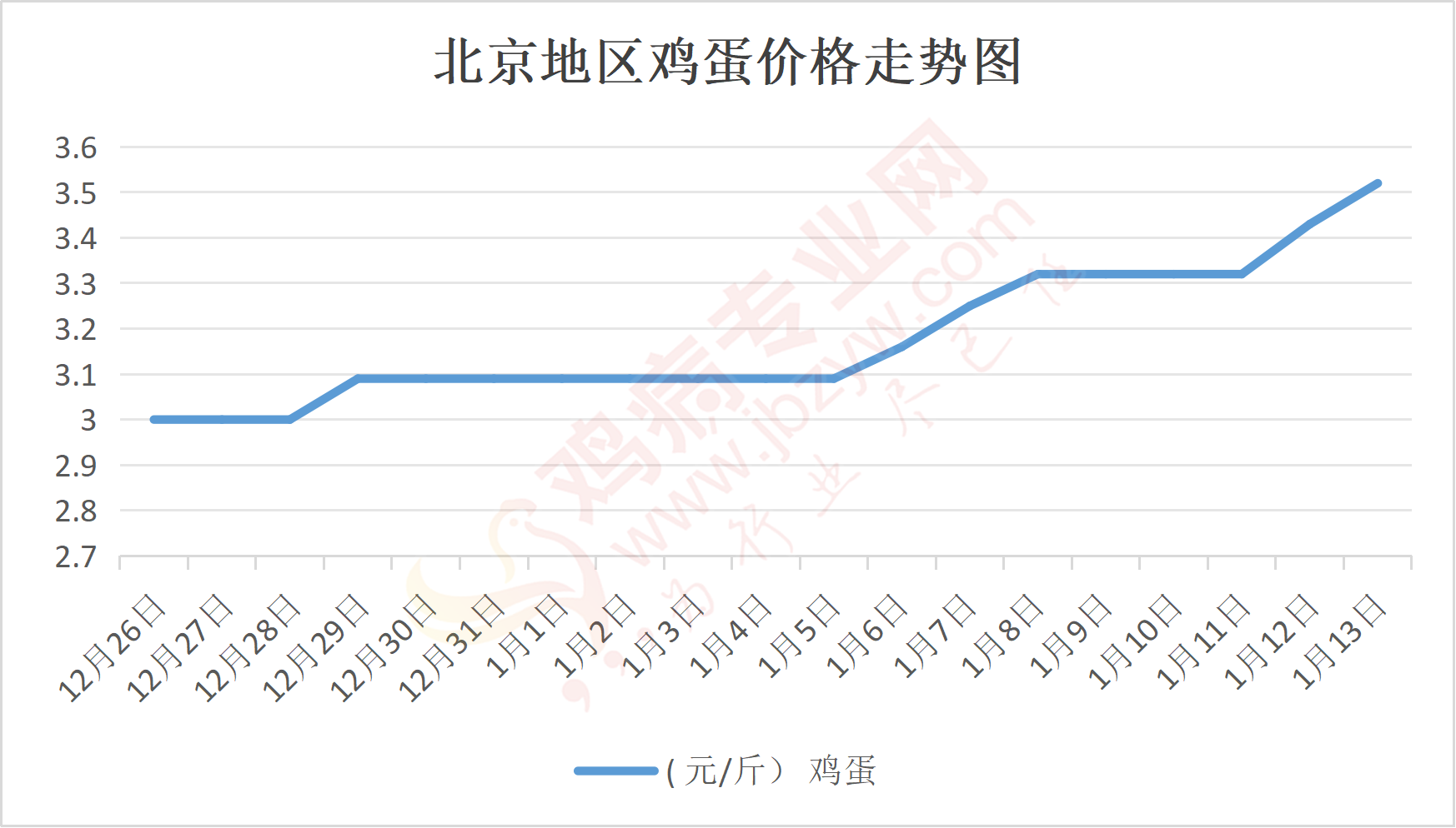 鸡病专业网消息:1月13日,北京大洋路鸡蛋主流批发价格155-156元/44斤,涨,到货3台车,成交灵活,走货不快;回龙观鸡蛋155元/44斤,涨;顺义石门鸡蛋155元/44斤,涨。