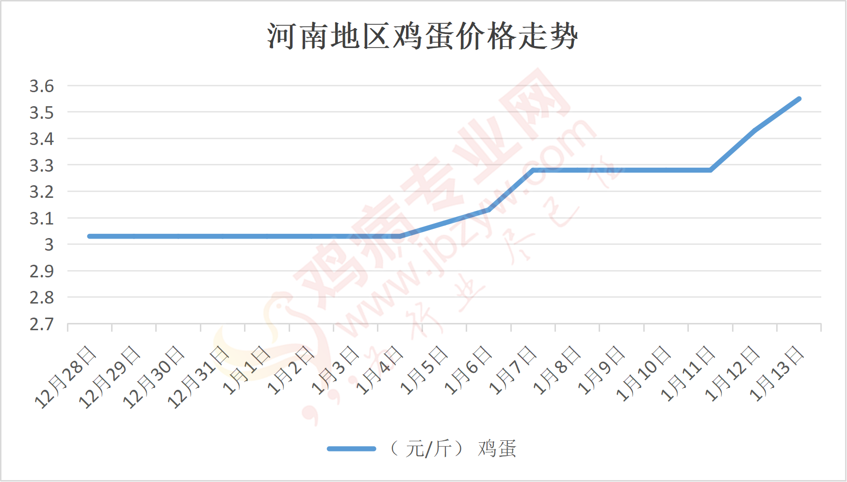 鸡病专业网消息:1月13日,河南郑州鸡蛋3.55元/斤,涨;新密鸡蛋3.55元/斤,涨;荥阳鸡蛋3.55元/斤,涨;中牟鸡蛋3.55元/斤,涨;周口鸡蛋3.55元/斤,涨;商丘鸡蛋105-106元/30斤,涨;鹤壁鸡蛋3.55元/斤,涨;汝州鸡蛋3.55元/斤,涨;开封鸡蛋106元/30斤,涨;漯河鸡蛋3.55元/斤,涨;漯河临颍鸡蛋3.55元/斤,涨;许昌鸡蛋3.55元/斤,涨;南阳鸡蛋3.55元/斤,涨;南阳邓州鸡蛋3.55元/斤,涨;新乡鸡蛋3.55元/斤,涨;安阳鸡蛋3.55元/斤,涨;新郑鸡蛋3.55元/斤,涨;登封鸡蛋3.55元/斤,涨;平顶山鸡蛋3.55元/斤,涨;驻马店鸡蛋3.55元/斤,涨;三门峡鸡蛋3.55元/斤,涨;焦作鸡蛋3.55元/斤,涨;信阳鸡蛋3.55元/斤,涨;濮阳鸡蛋3.55元/斤,涨。