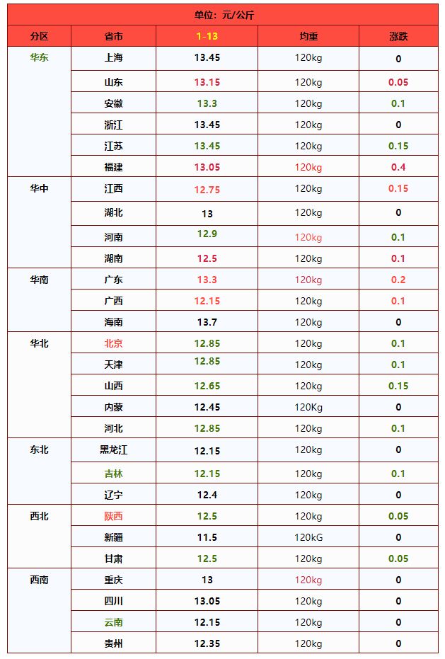 | 山东省 | 13.09 | 13.15 | -0.45% | 元/KG | |