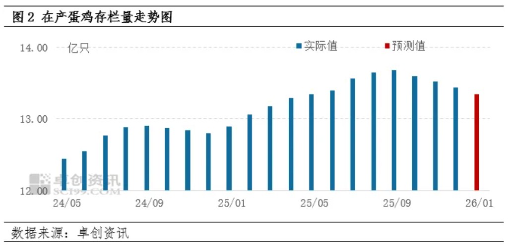 存栏微降,供应压力略有缓解。1月份新开产蛋鸡是2025年9月份补栏的鸡苗,此阶段养殖盈利欠佳,养殖企业补栏积极性不高,因此1月份新开产蛋鸡数量环比减少。老母鸡出栏方面,养殖企业大多计划春节前出栏老鸡,1月老母鸡出栏量或增加。综合来看,1月份老母鸡出栏量大于新开产蛋鸡数量,在产蛋鸡存栏量小幅下滑,预计1月份在产蛋鸡存栏量理论值或在13.34亿只左右,环比下降0.74%。存栏量微降,鸡蛋供应压力缓解。