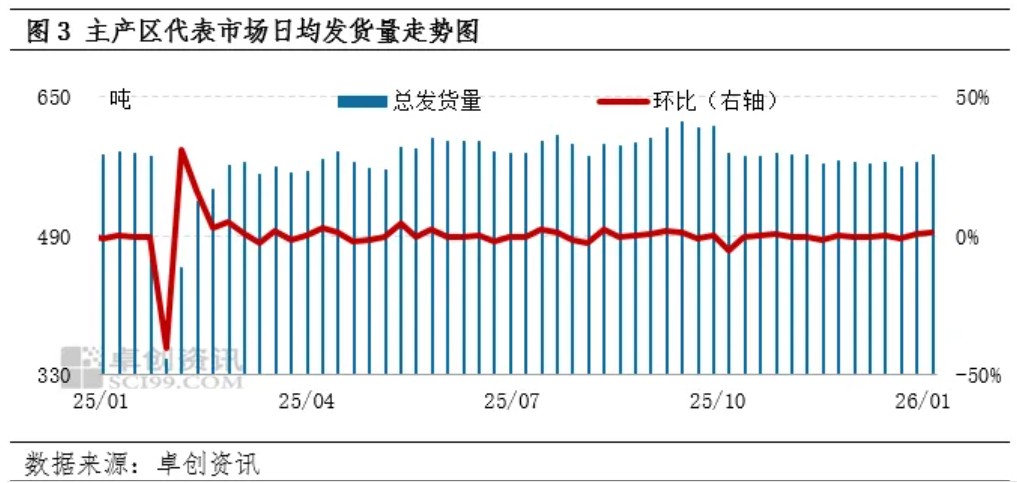 元旦后补货,鸡蛋需求量增加。元旦过后,下游贸易商陆续开始补货,在产地的鸡蛋采购量增加。据卓创资讯监测,1月份第1周主产区代表市场日均发货量为582.68吨,环比增幅1.49%,同比降幅0.57%。