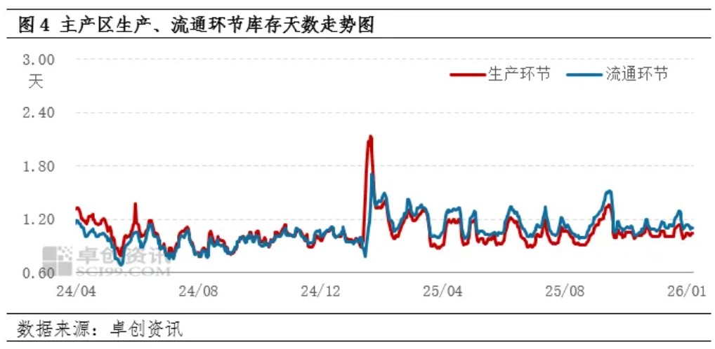 产区积极出货,库存量不大。1月份产区各环节积极出货,据卓创资讯监测数据显示,1月上旬主产区生产、流通环节库存天数大多在1天左右,少数2天,库存量均不大。春节前鸡蛋走货速度加快,各环节顺势购销,预计库存量在1天左右的正常水平。