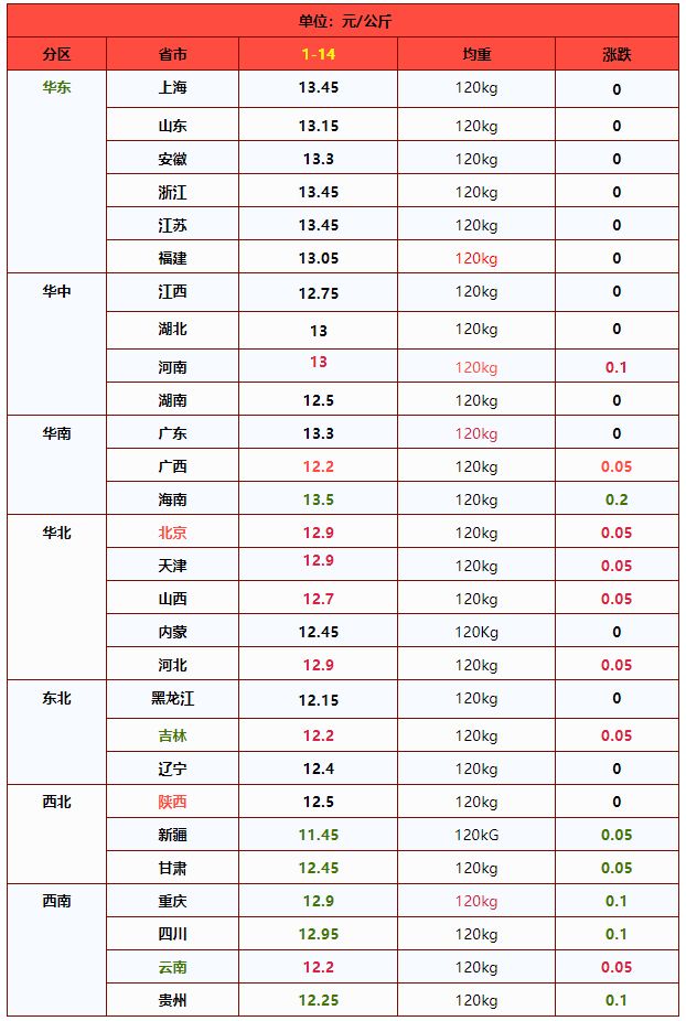 | 山东省 | 13.10 | 13.09 | 0.05% | 元/KG | |