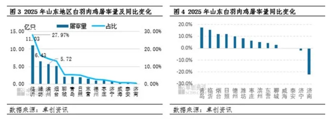 从2023-2025年山东地区白羽肉鸡屠宰量变动趋势研判,纯新增屠宰企业数量相对有限,屠宰增量贡献更多来自头部企业二期项目的在建与投产落地。结合当前调研的企业在建及拟投产项目情况,2026年山东省内产能增量最为显著的区域仍将是临沂市,保守预计该区域将新增日屠宰产能80-100万只,为2026年山东市场宰杀量继续提升注入“新”动能。