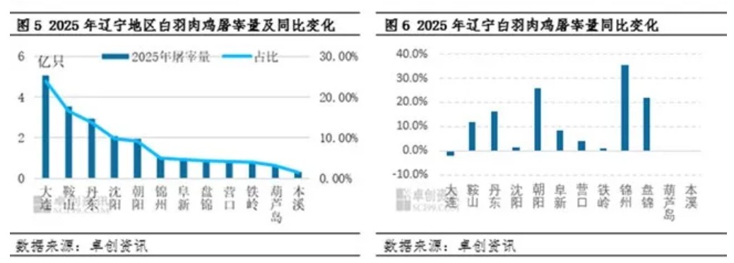 卓创资讯调研得出,辽宁省白羽肉鸡屠宰企业共计调研55家,年内头部企业扩产、增量情况同样较多。白羽肉鸡屠宰企业集中分布于大连、鞍山、丹东及沈阳4个地级市,共计34家,其他地级市企业数量均低于5家。从企业屠宰量占比来看,大连凭借数量及产量优势位居省内榜首,全年共计屠宰量为5.06亿只,同比跌幅2.01%,占省内屠宰总量的23.86%,同比下滑2.57个百分点;鞍山及丹东的屠宰量分别为3.52亿只、2.94亿只,屠宰量同比增幅分别在11.91%、16.32%,占辽宁省屠宰量比重较去年分别提升0.50个百分点、0.93个百分点,分别位列辽宁省第二、第三。2025年辽宁地区凭借一条龙及大型规模企业的规模优势,继续发力,年度屠宰量整体保持稳步增加趋势。展望2026年,从2025年在建项目及2026年拟投产项目规划来看,辽宁地区纯新增产能及二期扩产项目的投产计划相对有限,区内多数企业2026年的发展重心仍聚焦于提质保量。部分企业布局的新增项目,其产能释放所带来的屠宰量增量,预计要到2027年才能逐步兑现。而各类新增及投产项目的最终落地节奏,仍需结合2026年白羽肉鸡市场行情走势进一步研判。