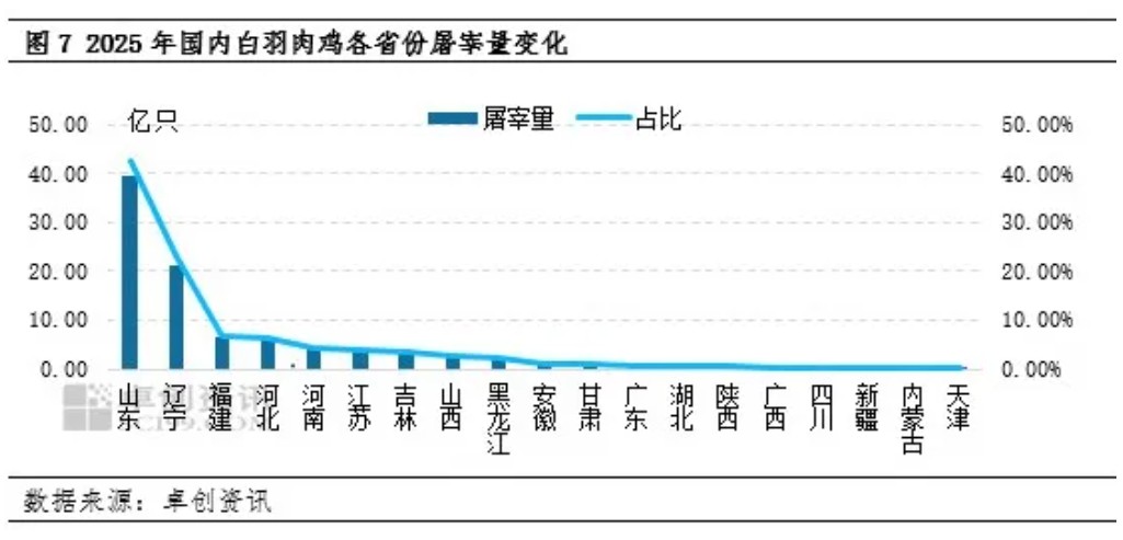 分省来看,2025年山东省实际屠宰量仍旧稳居全国榜首,共计宰杀39.43亿只,同比涨幅9.85%,较2024年屠宰量同比增幅明显,年内部分新企业的加入、龙头企业进一步扩产,部分中小企业虽有减产、关停影响,但前期关停企业同样出现换手后继续运营的情况,加之2025年屠宰环节理论盈利同比提升明显,多重原因共同推动,导致山东省白羽肉鸡屠宰量攀升。从省份占比来看,山东地区占全国总量的42.42%,较去年屠宰量全国占比上涨0.90个百分点,占据全国白羽肉鸡市场半壁江山;辽宁省排名第二,2025年全年屠宰量为21.21亿只,同比涨幅8.55%,占全国总屠宰量的22.82%,省份占比较去年提升0.22个百分点,辽宁地区屠宰量的显著提升,和年内龙头企业新厂的投产密不可分;福建省排名第三,2025年全年共计屠宰6.35亿只毛鸡,同比增幅2.25%,占全国实际屠宰总量6.83%,屠宰占比较去年略降6.83个百分点,当地龙头企业发展速度相对稳健,导致自身宰杀量增幅有限所致。以上三省份白羽肉鸡屠宰量占全国的72.07%,同比提升0.77个百分点,2025年共计屠宰白羽肉鸡66.98亿只。山东及辽宁屠宰企业分布密集,多达154家,不同地级市屠宰产能分布有差异;而福建省龙头企业优势明显,屠宰量占比居全国第三。