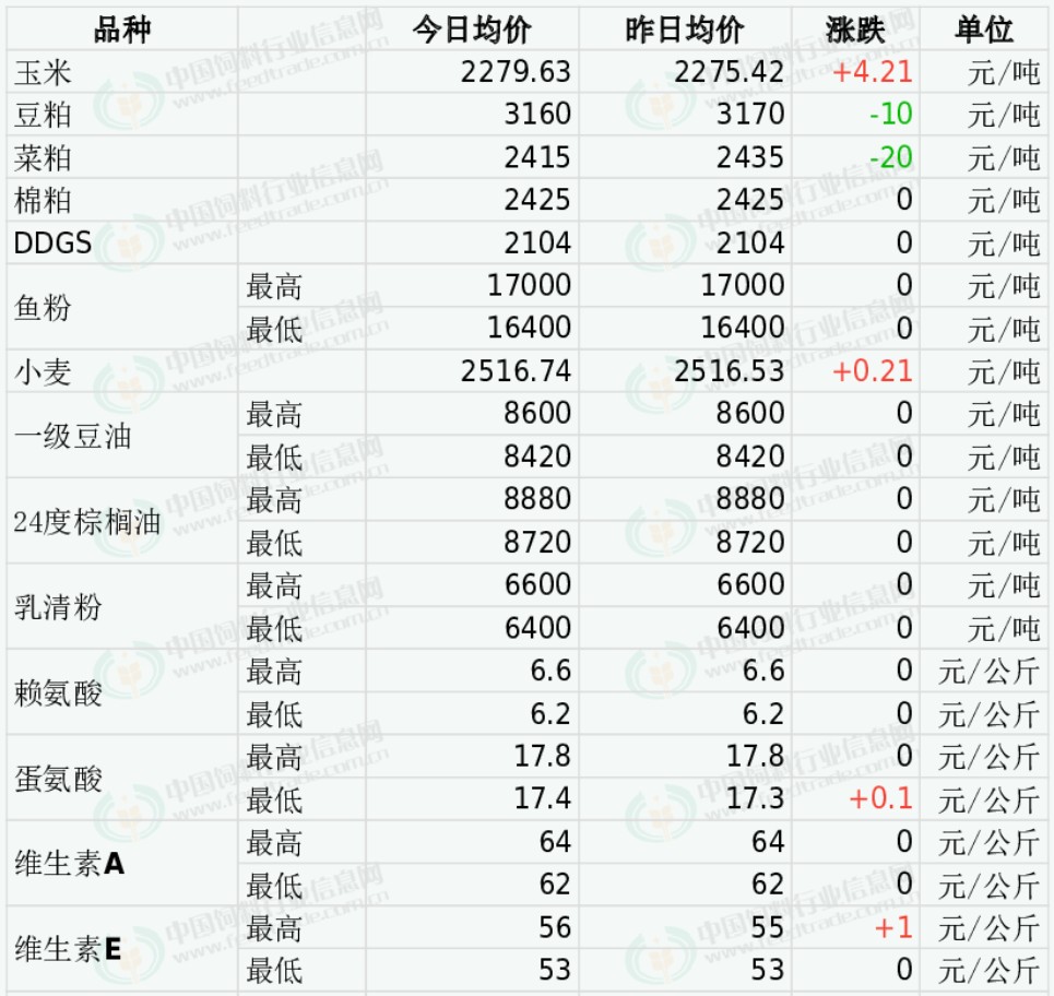 外盘方面,秘鲁本季超级蒸汽鱼粉预售参考价格为CNF2150美元/吨,新季预售参考2100美元/吨。国内进口鱼粉观望顺价保持,且需求一般,当前秘鲁超级蒸汽鱼粉价格集中在16400-17000元。国产鱼粉降价,山东荣成地区63%蛋白TVN150的国产鱼粉参考报价在13200元/吨,跌400元;短期持货商顺价观望为主。