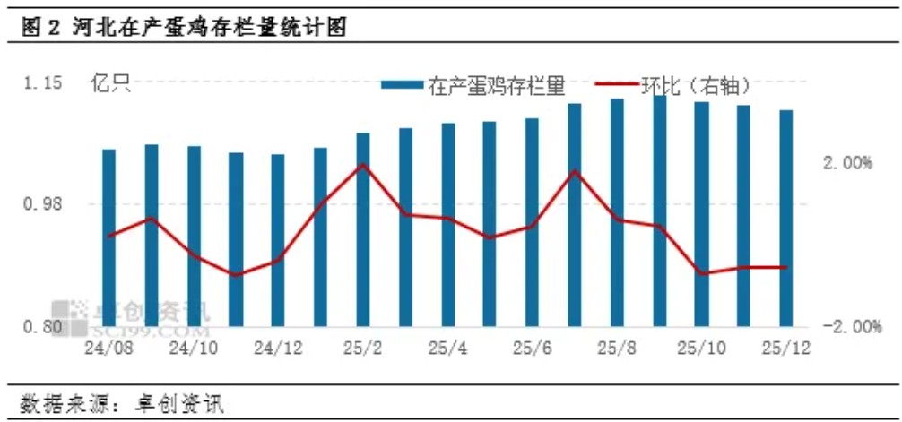 由于11-12月份鸡蛋价格持续在底部徘徊,养殖单位多顺势出栏大日龄蛋鸡,加之新开产蛋鸡数量逐渐下降,在产蛋鸡存栏量呈现高位回落态势。根据卓创资讯监测数据显示,2025年12月份河北在产蛋鸡存栏量约为1.11亿只,环比减幅0.54%。存栏量略有下降,鸡蛋供应压力稍有缓解,加之业者对春节前行情多有看涨预期,且低温天气利于鸡蛋存储,养殖环节惜售情绪增加,而春节备货启动,下游销区市场以及食品厂入市采购量均增加,产区出现走货快、收货难度加大等情况,拉动蛋价持续走高。