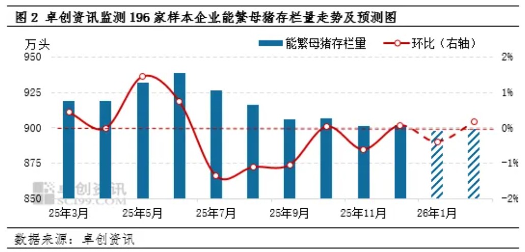 卓创资讯预计2026年生猪养殖收入或同比回落11.57%。养殖收入主要受生猪价格及生猪交易均重影响。从生猪行情来看,2026年生猪供应或较为充沛,猪价有同比回落的可能。由于能繁母猪存栏量影响10个月后的生猪出栏量,因此2025年3月-2026年2月的能繁母猪存栏量影响2026年的生猪供应量。根据卓创资讯监测的样本企业能繁母猪存栏量来看,2025年7月份能繁母猪存栏量开始出现下滑动作,且连续3个月降幅超过1.00%,但此后跌幅较为有限,因此2026年上半年生猪价格或呈现震荡下滑态势,下半年有上涨空间,但受去产能速度较慢的影响,猪价回暖速度或较为缓慢。结合生猪交易均重,卓创资讯预计2026年生猪养殖收入或呈春节前最高、此后快速回落至低位、下半年震荡上涨的趋势。