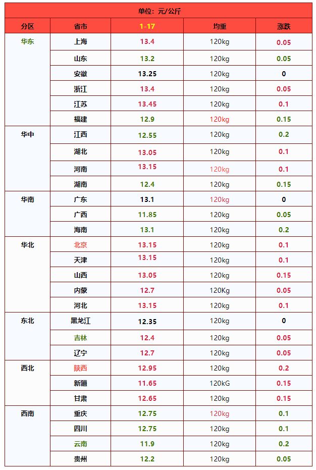 由此分析,受以上因素,预计,1月17日,外三元标猪报价在12.72元/公斤,上涨0.01元,猪价维持震荡上涨的走势,后市关注规模以上猪企出栏节奏的变化!