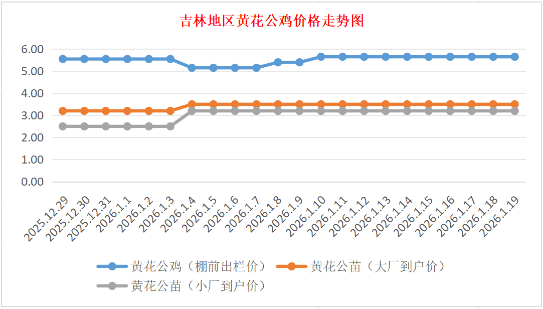 黄花公苗:价格稳定,大厂到户价3.50元/羽,小厂到户价3.20元/羽,稳。