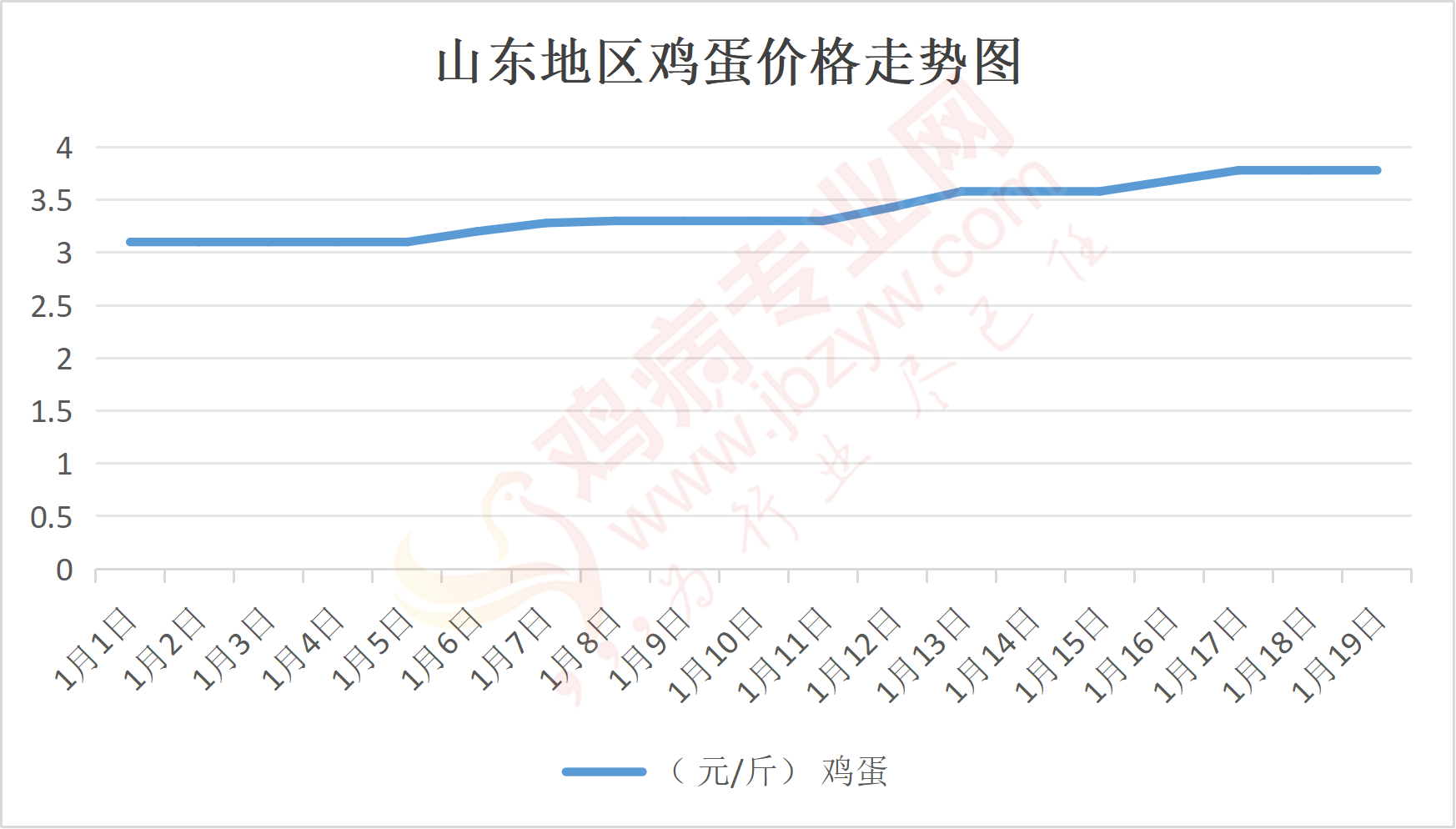 鸡病专业网消息:1月19日,山东地区莱阳鸡蛋3.8元/斤,稳;青岛鸡蛋3.8元/斤,稳;诸城鸡蛋3.8元/斤,稳;安丘鸡蛋3.75元/斤,稳;昌乐鸡蛋3.75元/斤,稳;寿光鸡蛋3.75元/斤,稳;昌邑鸡蛋3.75元/斤,稳;高密鸡蛋3.8元/斤,稳;青州鸡蛋3.75元/斤,稳;临朐鸡蛋3.75元/斤,稳;莱州鸡蛋3.8元/斤,稳;威海鸡蛋3.8元/斤,稳;临沭鸡蛋3.75元/斤,稳;沂水鸡蛋3.75元/斤,稳;沂南鸡蛋3.75元/斤,稳;莒南鸡蛋3.75元/斤,稳;兰陵县鸡蛋3.75元/斤,稳;日照鸡蛋3.75元/斤,稳;莒县鸡蛋3.75元/斤,稳;日照辛萁商贸鸡蛋3.75元/斤,稳;泗水鸡蛋价格111元/30斤,稳;济宁、汶上鸡蛋价格111元/30斤,稳;梁山、东平红蛋价格111元/30斤,稳;枣庄滕州地区鸡蛋混码主流到户112元/30斤,稳;泰安地区新泰鸡蛋价格111元/30斤,稳;菏泽地区曹县主流到户111元/30斤,稳;成武鸡蛋价格111元/30斤,稳;单县到户111元/30斤,稳;聊城莘县111元/30斤,稳;莱芜鸡蛋167元/45斤,稳;济南鸡蛋167元/45斤,稳;德州鸡蛋148元/40斤,稳;滨州鸡蛋148元/40斤,稳。