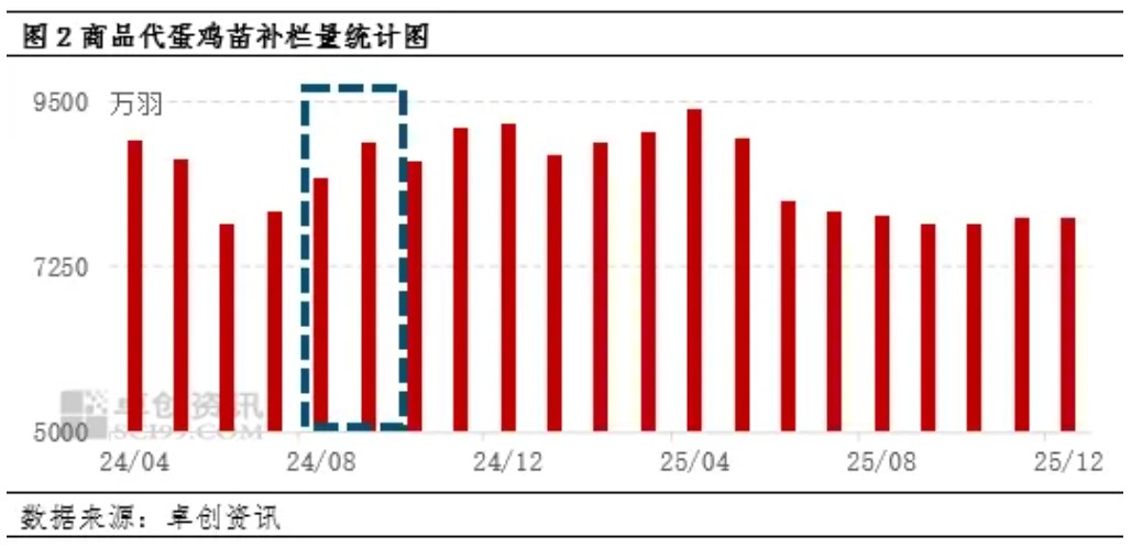 根据蛋鸡养殖周期规律推算,2026年1月待出栏的老母鸡主要对应2024年8-9月补栏的鸡苗。卓创资讯监测数据显示,2024年9月鸡苗市场需求呈现积极态势,补栏量环比显著增长,涨幅超过5.00%。这一前期补栏量的增加,直接导致2026年1月理论待出栏老母鸡的供应量有所提升,从而对本月老母鸡供应端形成一定程度的利多支撑。