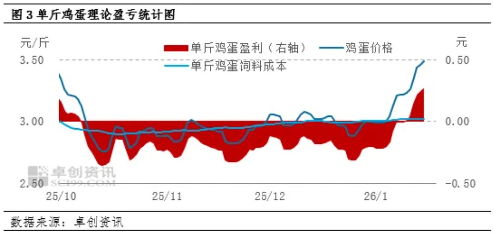 一方面,2026年1月鸡蛋市场呈现价格与饲料成本同步上涨的态势,但鸡蛋价格涨幅显著高于饲料成本,推动蛋鸡养殖效益由亏转盈。据卓创资讯监测数据显示,1月1-15日,鸡蛋价格累计上涨16.72%,而饲料价格仅上涨0.53%,蛋价幅度远超饲料价格涨幅,使得月内蛋鸡养殖扭亏为盈,行业重新进入盈利周期。这一盈利改善显著提振了养殖户信心,惜售情绪随之明显升温,市场供应节奏放缓。