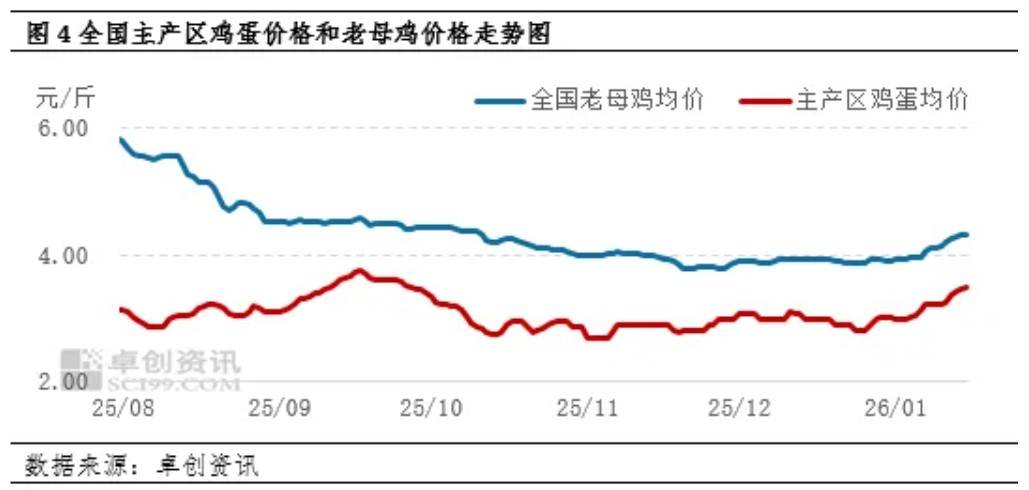 另一方面,鸡蛋价格的持续上行对老母鸡收购市场形成显著联动效应。如图4所示,月内老母鸡收购价格累计上涨10.46%,涨幅与蛋价上行趋势形成同频共振。受养殖户“卖跌不卖涨”的传统心理影响,出栏决策更趋谨慎,出栏节奏放缓——卓创资讯监测数据显示,老母鸡出栏日龄较月初延迟2-3天,这一指标直观反映了养殖端的惜售倾向。