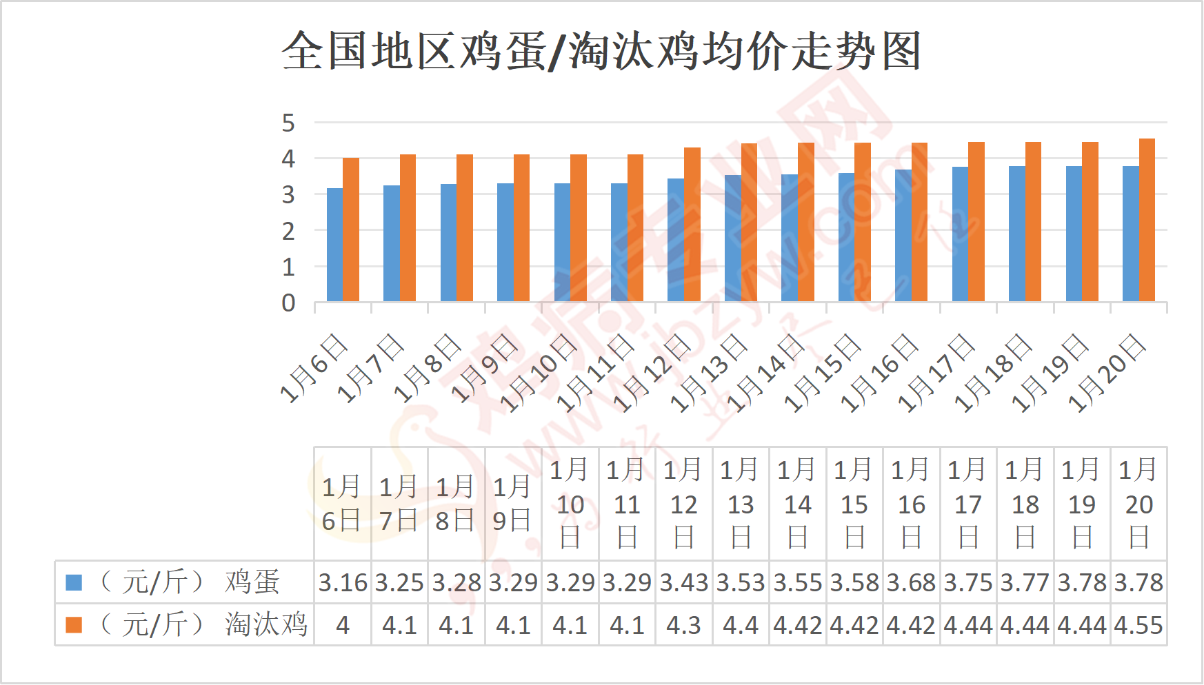 湖北地区:新洲鸡蛋3.8元/斤,与昨日相比持平,淘汰鸡4.1-4.6元/斤;
