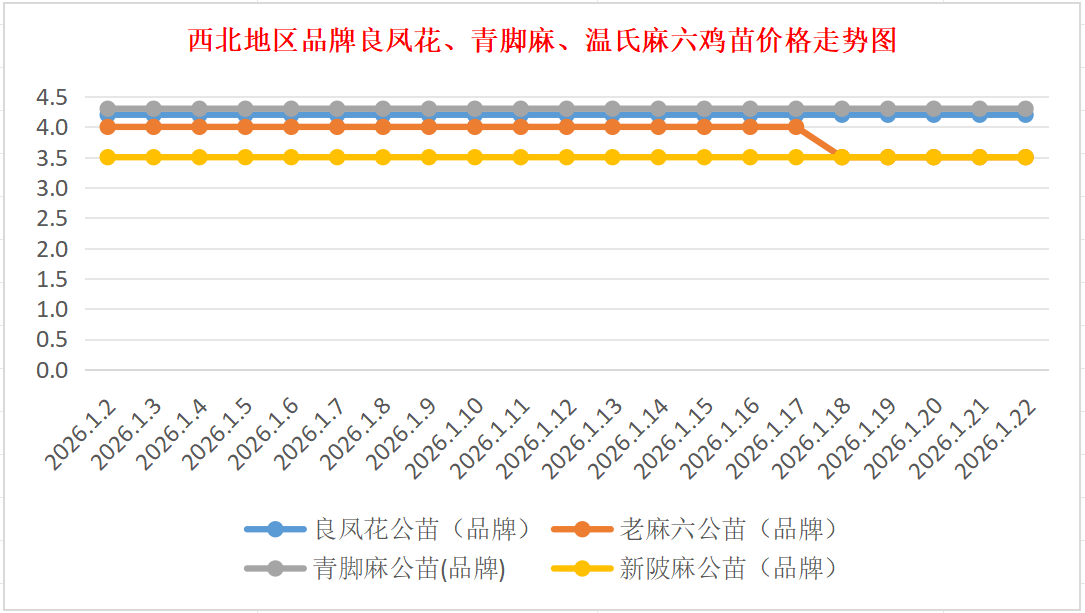 品牌青脚麻公苗(多品种快大型):价格稳定,到户价4.30元/羽,稳。