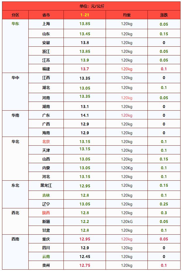 | 华北 | 北 京 | 12.92 | 13.05 | -1.00% | 元/KG |