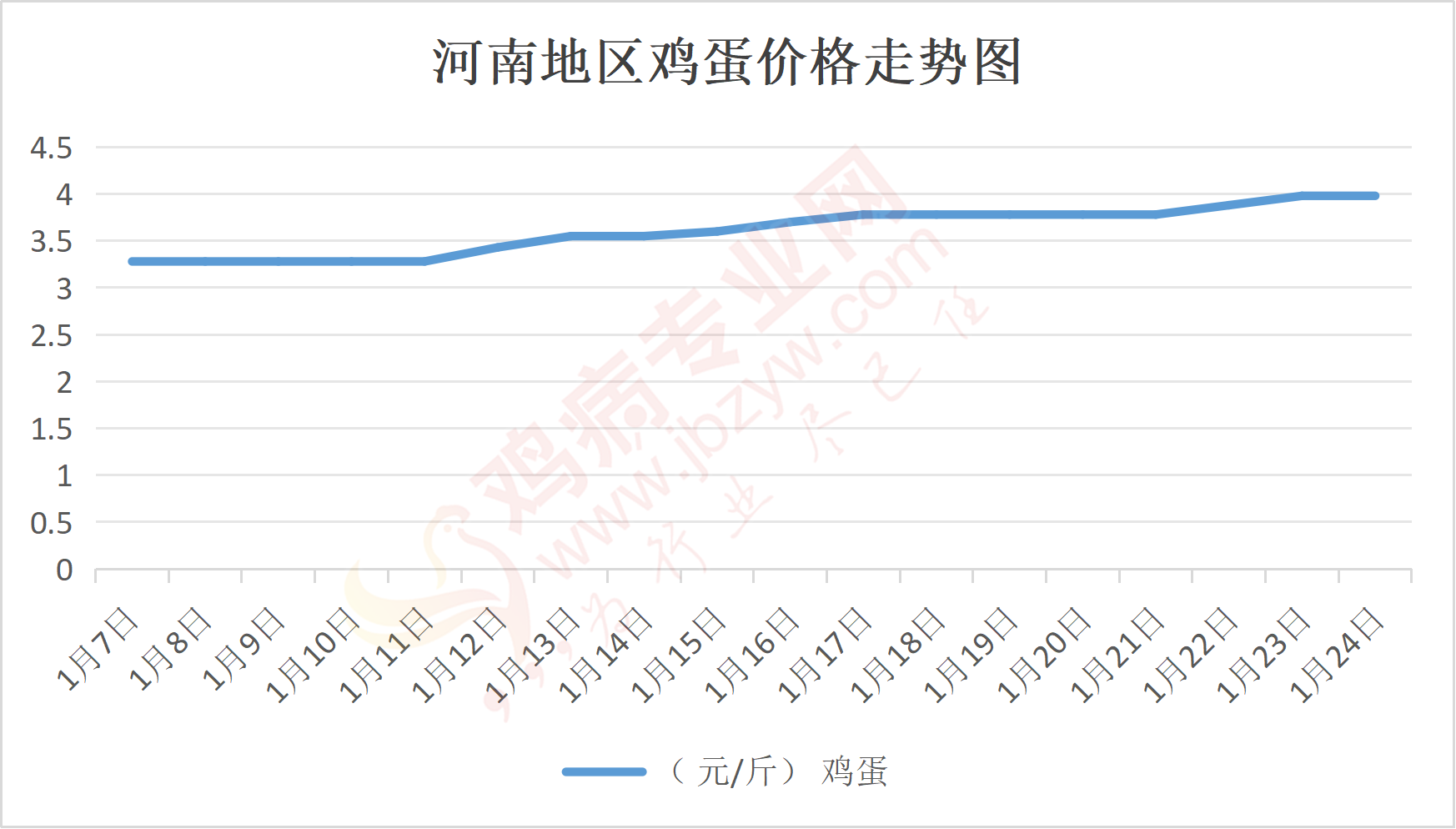 鸡病专业网消息:1月24日,河南郑州鸡蛋4元/斤,稳;新密鸡蛋4元/斤,稳;荥阳鸡蛋4元/斤,稳;中牟鸡蛋4元/斤,稳;周口鸡蛋4元/斤,稳;商丘鸡蛋118元/30斤,稳;鹤壁鸡蛋4元/斤,稳;汝州鸡蛋4元/斤,稳;开封鸡蛋118元/30斤,稳;漯河鸡蛋3.95元/斤,稳;漯河临颍鸡蛋4元/斤,稳;许昌鸡蛋4元/斤,稳;南阳鸡蛋4元/斤,稳;南阳邓州鸡蛋4元/斤,稳;新乡鸡蛋3.95元/斤,稳;安阳鸡蛋3.95元/斤,稳;新郑鸡蛋4元/斤,稳;登封鸡蛋4元/斤,稳;平顶山鸡蛋4元/斤,稳;驻马店鸡蛋3.95元/斤,稳;三门峡鸡蛋4元/斤,稳;焦作鸡蛋4元/斤,稳;信阳鸡蛋3.95元/斤,稳;濮阳鸡蛋3.95元/斤,稳。
