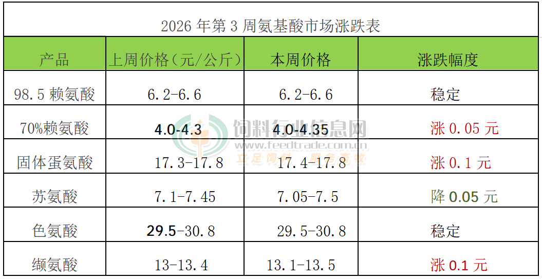 赖氨酸市场中,98%赖氨酸参考报价区间6.2-6.6元/公斤,70%赖氨酸参考报价区间4.0-4.35元/公斤。2025年11月,我国赖氨酸与赖氨酸盐及酯的出口量为9万吨,同比降4%,环比增5.8%。万里润达氨基酸生产线计划近日阶段性升级检修。本周金玉锋98.5%赖氨酸报价6.25元/公斤,70%赖氨酸报价4.1元/公斤,较此前报价小涨,玉米价格反弹以及节前备货存支撑,赖氨酸市场稳中偏强运行。