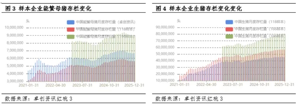 国内豆粕下游行业主要分布在饲料行业,其占比达到90%以上,其中,生猪养殖是豆粕最大的消费领域,此外还有畜禽、水产、反刍、宠物等领域。以生猪产能为例,根据卓创资讯监测196家样本养殖企业2025年能繁母猪存栏数据呈现先增后降态势,全年数据处于高位运行。卓创资讯监测196家样本养殖企业生猪存栏数据自2023年12月起呈现连续增加态势,截至2025年12月,能繁母猪存栏同比增长0.31%,生猪存栏同比增长10.36%。