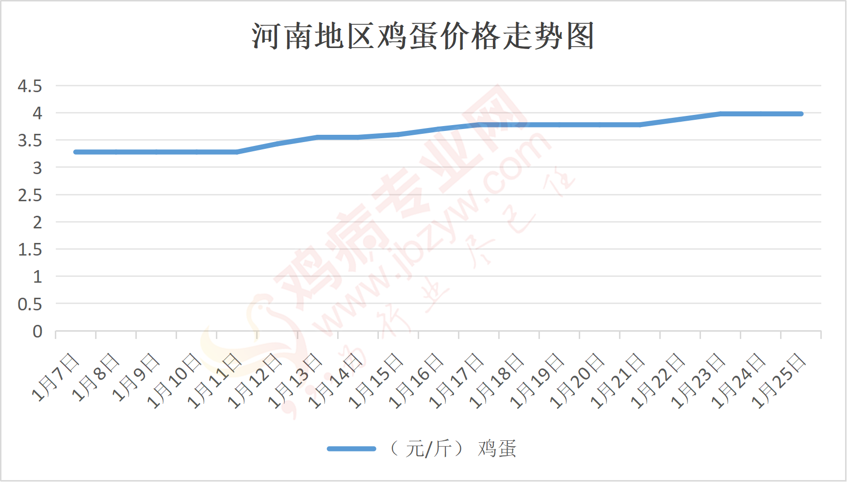 鸡病专业网消息:1月25日,河南郑州鸡蛋4元/斤,稳;新密鸡蛋4元/斤,稳;荥阳鸡蛋4元/斤,稳;中牟鸡蛋4元/斤,稳;周口鸡蛋4元/斤,稳;商丘鸡蛋118元/30斤,稳;鹤壁鸡蛋4元/斤,稳;汝州鸡蛋4元/斤,稳;开封鸡蛋118元/30斤,稳;漯河鸡蛋3.95元/斤,稳;漯河临颍鸡蛋4元/斤,稳;许昌鸡蛋4元/斤,稳;南阳鸡蛋4元/斤,稳;南阳邓州鸡蛋4元/斤,稳;新乡鸡蛋3.95元/斤,稳;安阳鸡蛋3.95元/斤,稳;新郑鸡蛋4元/斤,稳;登封鸡蛋4元/斤,稳;平顶山鸡蛋4元/斤,稳;驻马店鸡蛋3.95元/斤,稳;三门峡鸡蛋4元/斤,稳;焦作鸡蛋4元/斤,稳;信阳鸡蛋3.95元/斤,稳;濮阳鸡蛋3.95元/斤,稳。