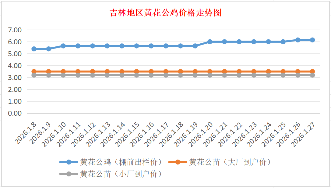 黄花公苗:价格稳定,大厂到户价3.50元/羽,小厂到户价3.20元/羽,稳。