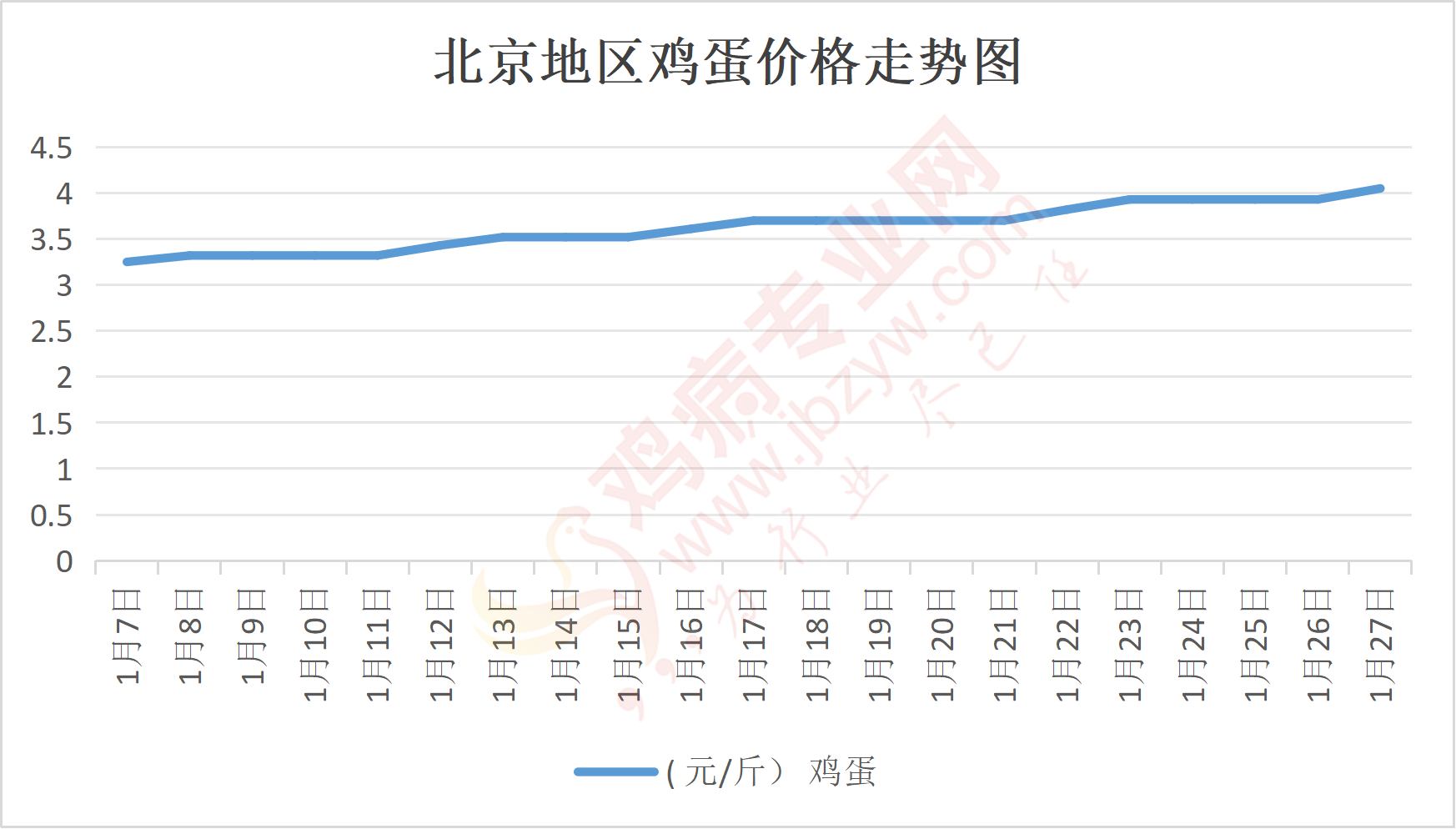 鸡病专业网消息:1月27日,北京大洋路鸡蛋主流批发价格178-179元/44斤,涨,到货3台车,成交灵活,走货一般;回龙观鸡蛋178元/44斤,涨;顺义石门鸡蛋178元/44斤,涨。