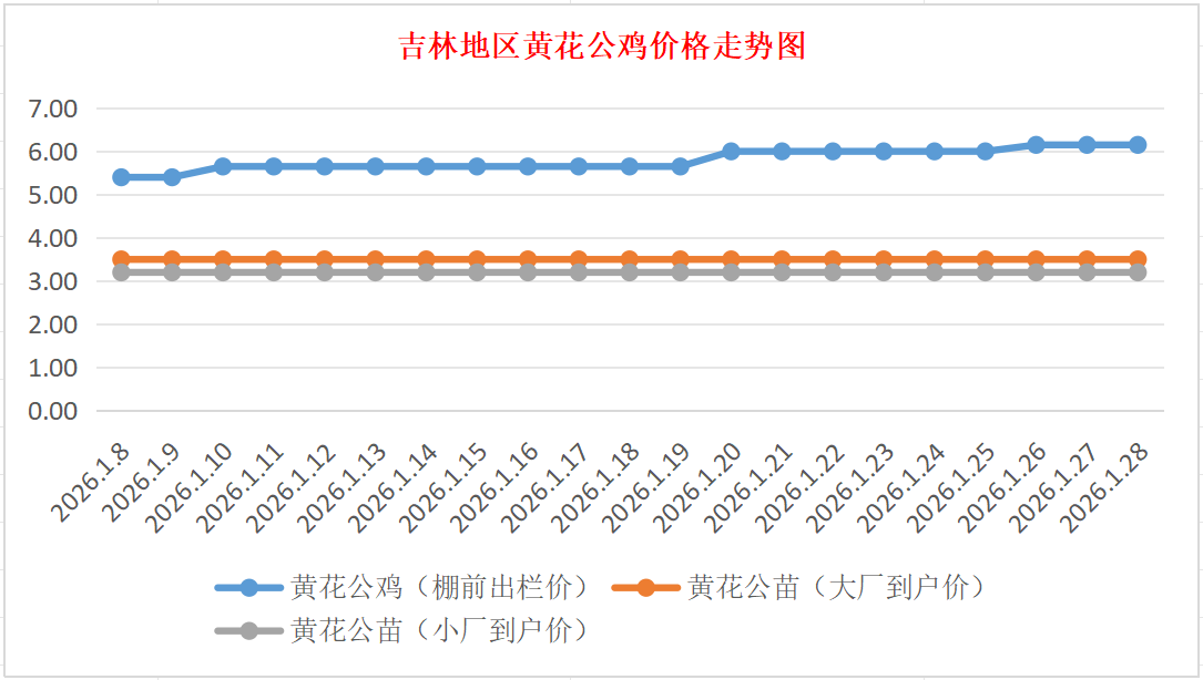 黄花公苗:价格稳定,大厂到户价3.50元/羽,小厂到户价3.20元/羽,稳。