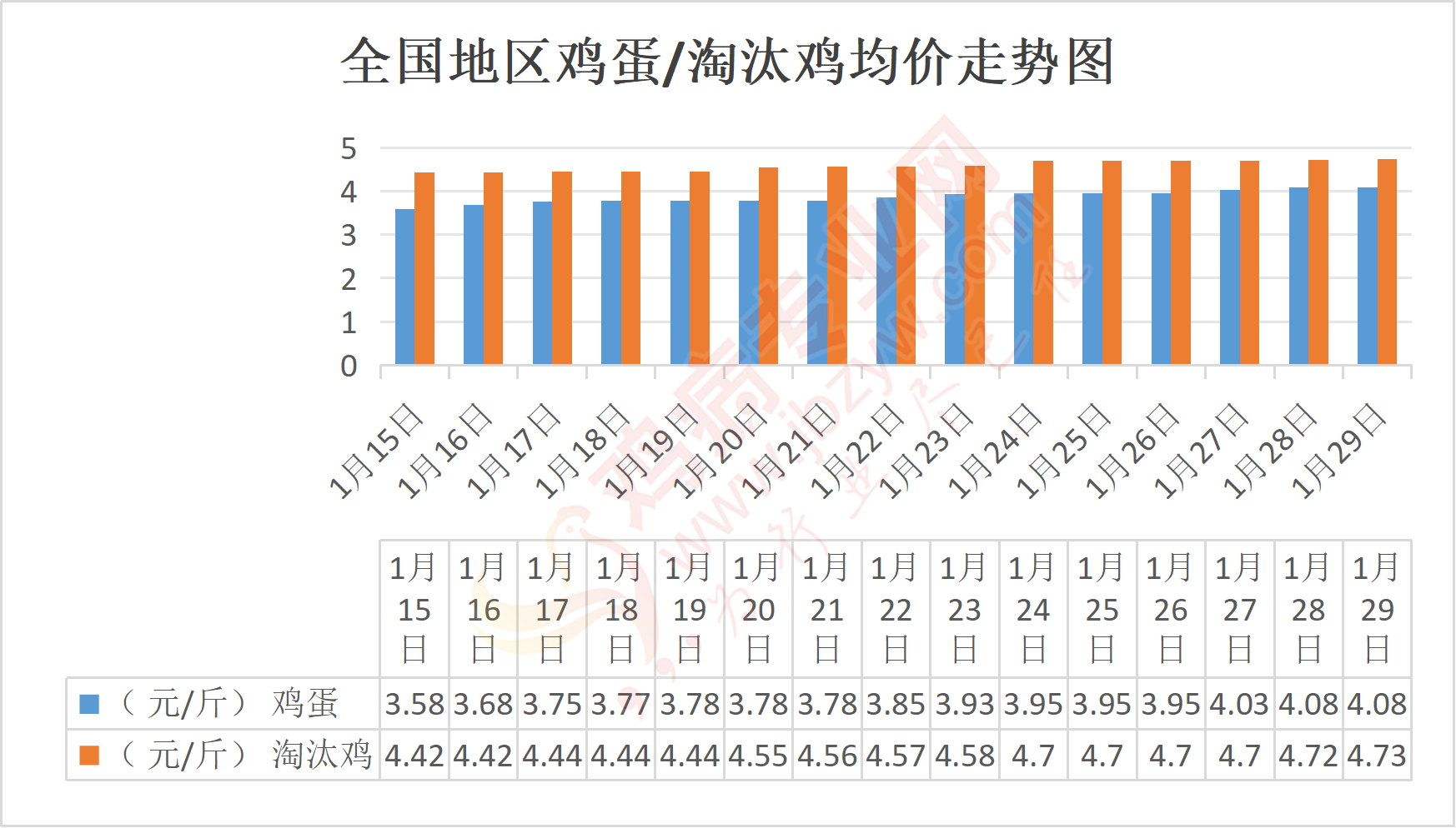 湖北地区:新洲鸡蛋4.1元/斤,与昨日相比持平,淘汰鸡4.3-4.7元/斤;